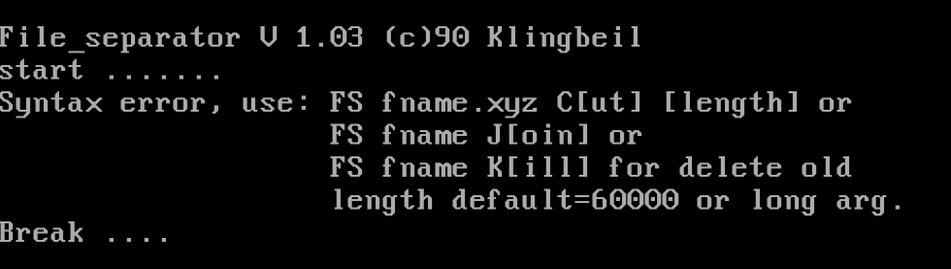 Als in den frühen Jahren der PC Technik Dateien (Programme, Bilder, etc.) immer mehr Speicher in Anspruch nahmen, wurde die Archivierung auf Datenträger schwierig. Mein Programm FS teilt beliebige Dateien in kleine Portionen auf, die dann auf mehrere Disketten verteilt gespeichert und auch wieder zusammengefügt werden können. Typischerweise wurden in den 80er Jahren 3,5" Disketten benutzt.